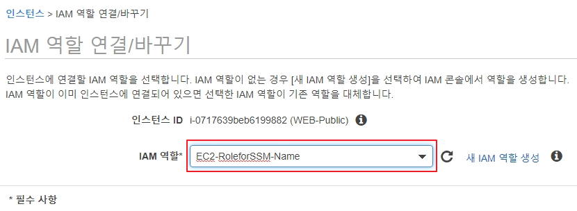 EC2를 선택 > 작업 > 인스턴스 설정 > IAM 역할 연결/바꾸기를 선택한다.