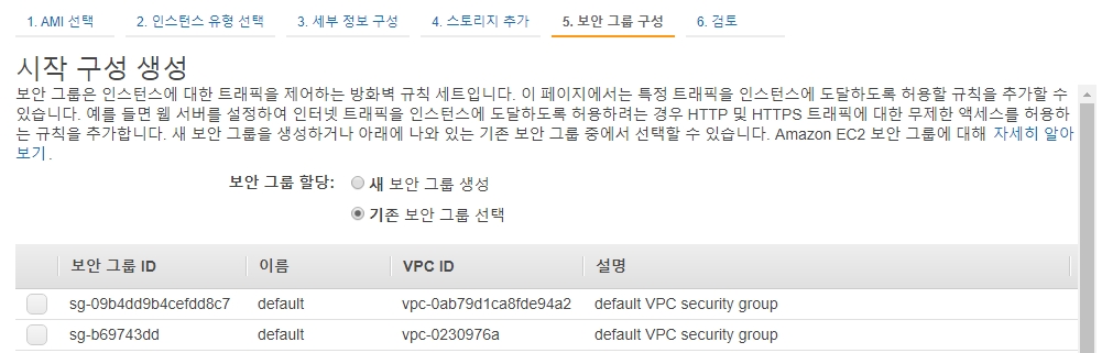 이미 생성되어 있는 인스턴스의 보안그룹을 선택하면 된다.