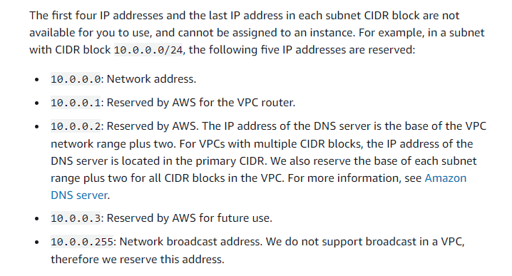 예를 들어서 10.0.0.0/24 대역으로 서브넷의 DIDR 블럭 설정하여 생성을 하게 되면 아래와 아이피는 이미 AWS 에서 예약된 아이피이므로 EC2인스턴스에서 사용할 수 없다.