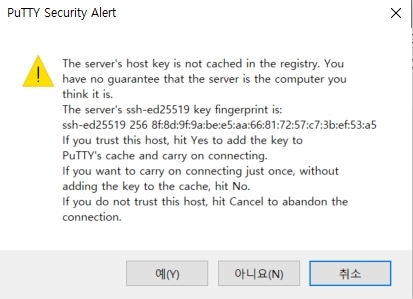 Putty 세션창이 뜨면서 아래 Alert 창이 뜨고 [예]클릭한다.