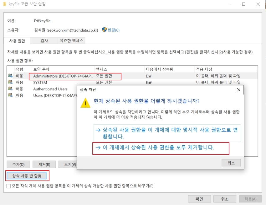 Administrators 그룹을 선택하고 하단의 [상속 사용 안함]을 클릭, "상속권한 모두 제거합니다".를 클릭한다.